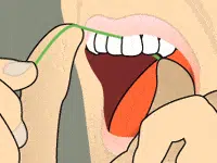 Use your thumbs and forefingers to guide about one inch of floss between your teeth.